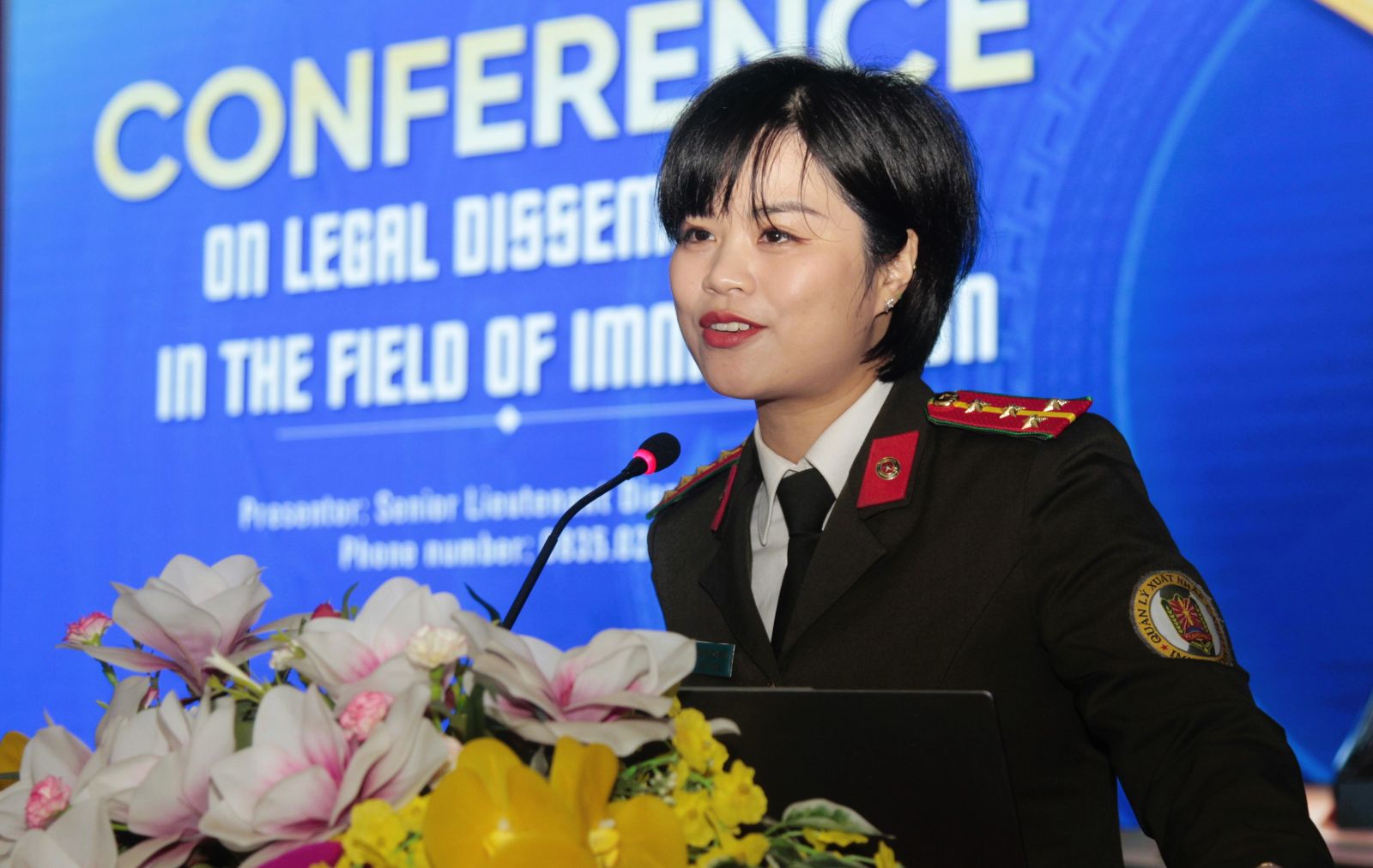 Đại diện Phòng Quản lý xuất nhập cảnh, Công an tỉnh Thái Nguyên tuyên truyền Quy định pháp luật Việt Nam về xuất nhập cảnh, cư trú đối với người nước ngoài.