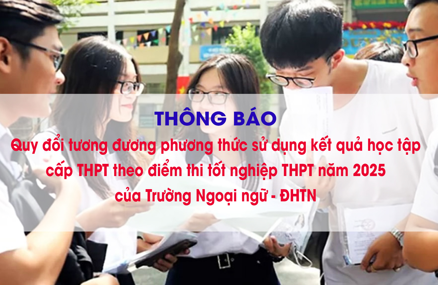 Thông báo về việc quy đổi tương đương phương thức sử dụng kết quả học tập cấp THPT theo điểm thi tốt nghiệp THPT năm 2025 của Trường Ngoại ngữ – ĐHTN Ngày cập nhật : Thứ hai , 28/07/2025 | 16:55 Sao chép liên kết Thông báo về việc quy đổi tương đương phương thức sử dụng kết quả học tập cấp THPT theo điểm thi tốt nghiệp THPT năm 2025 của Trường Ngoại ngữ – ĐHTN